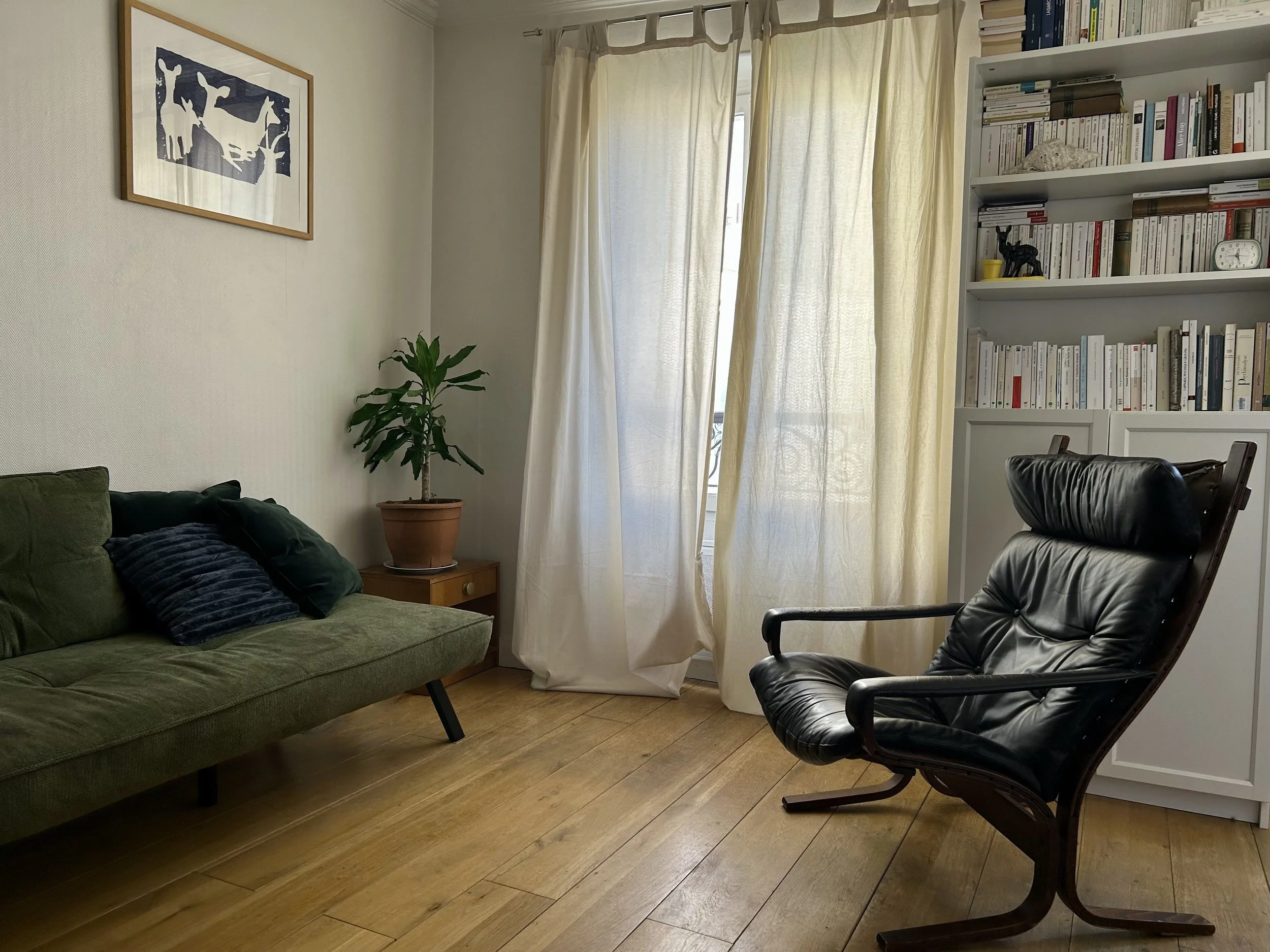 Une séance se déroule dans un espace d’écoute confidentiel, bienveillant et sans jugement, où votre parole peut se déployer librement. Je vous invite à dire ce qui vient — pensées, émotions, images, souvenirs, hésitations, silences — même lorsque cela semble confus ou insignifiant. C’est à partir de ces associations, de vos ressentis et de ce qui se présente au fil du moment, que nous avançons ensemble. Ce travail ne vise pas seulement à « aller mieux », mais à habiter plus pleinement sa vie intérieure, à se défaire de ce qui entrave, et à laisser émerger un positionnement plus libre, plus souple, plus vivant. La psychanalyse est ainsi un chemin de subjectivation : un processus par lequel ce qui semblait figé peut se remettre en mouvement et ouvrir de nouveaux possibles.